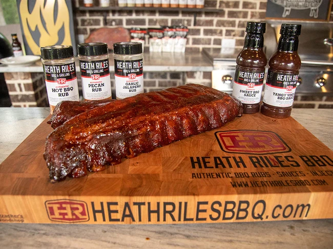 - Season the ribs. Yellow mustard is up first. I squirted it liberally on the ribs and coated the back side with a thin layer. Then I added my Heath Riles BBQ Garlic Jalapeño Rub as the base layer of dry seasoning. This is an award-winning all round delicious rub. Using this on the ribs will make them tangy and give them a kick from the jalapeño. After that, I layered on my Heath Riles BBQ Pecan Rub to add some sweetness, then went back over them with my Heath Riles BBQ Hot BBQ Rub for some extra heat.